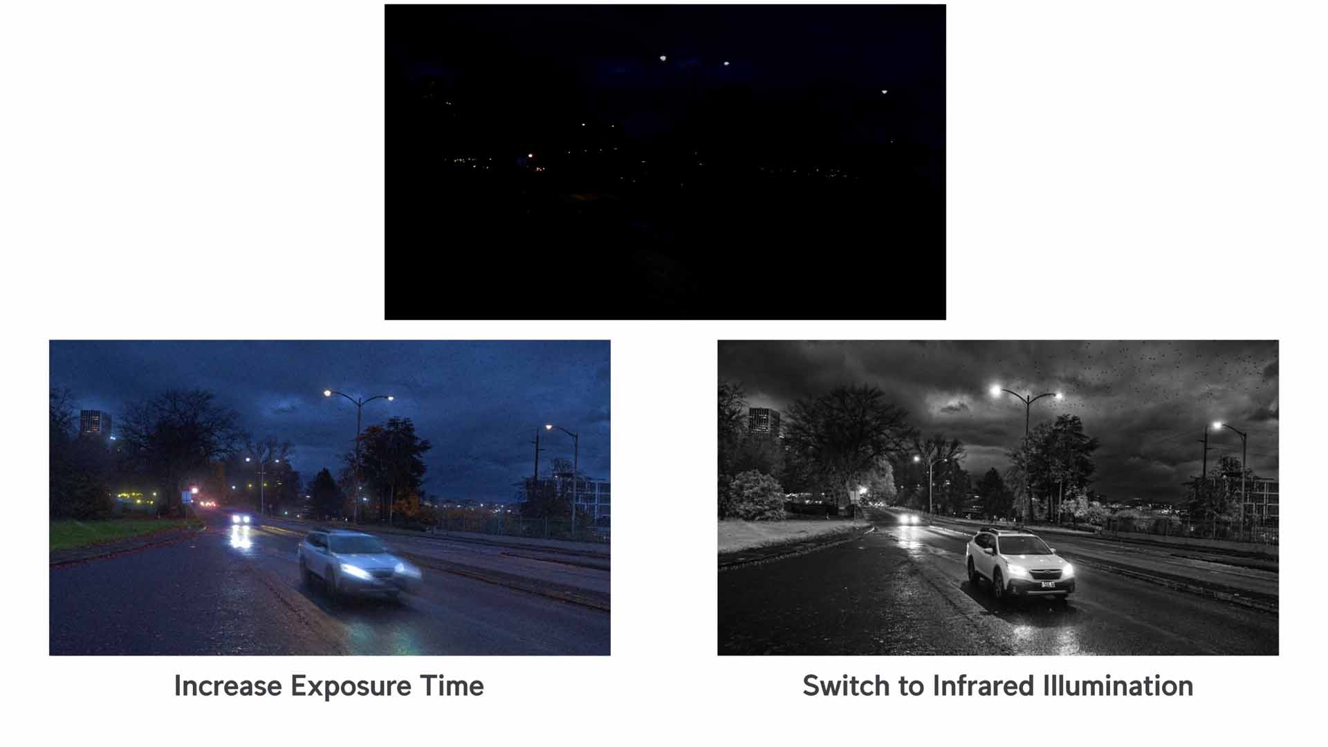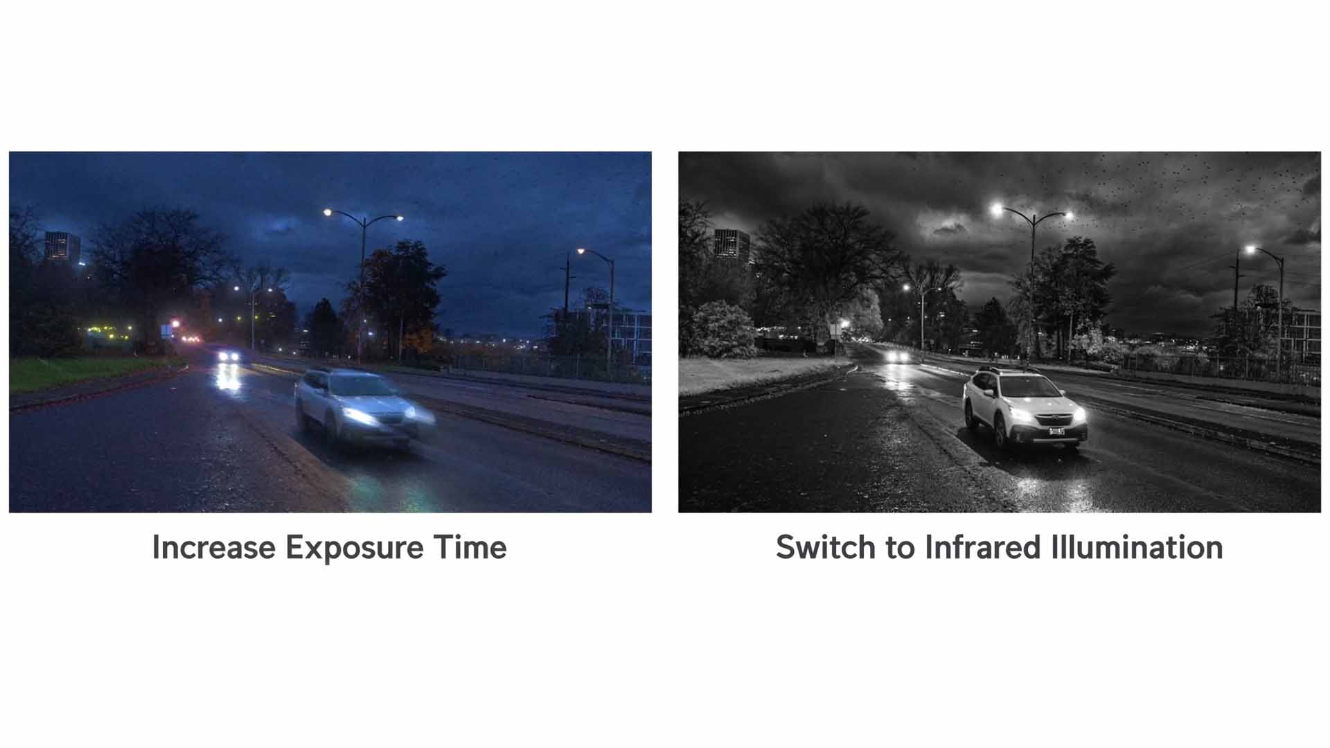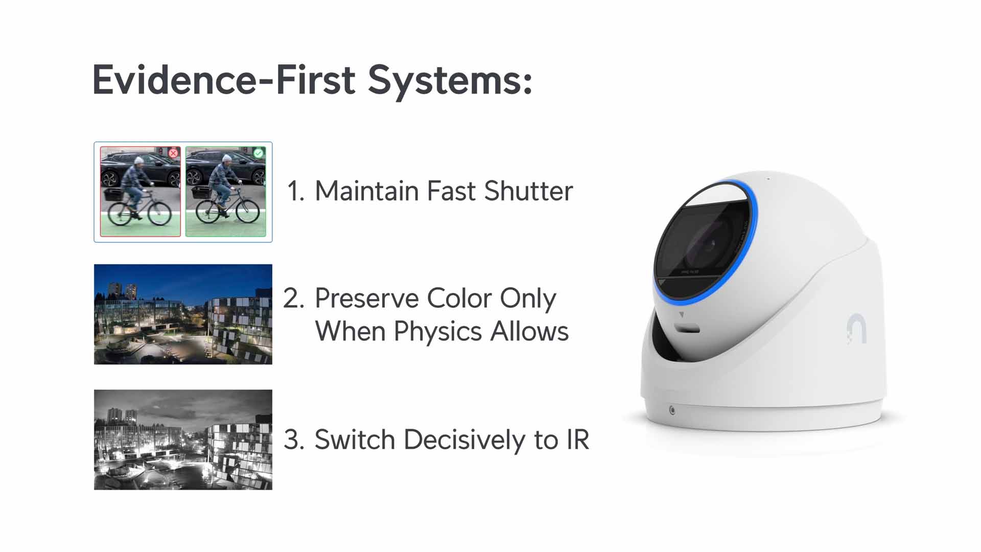 Multe sisteme de supraveghere — inclusiv unele foarte scumpe — extind expunerea cand lumina scade, pentru a pastra culorile vii. Rezultatul? Imagini frumoase, colorate, dar neclare. Intr-un incident real, aceste imagini sunt inutilizabile.