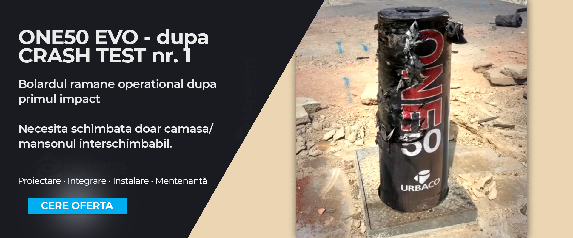 Spre deosebire de alte sisteme, ONE50 EVO a demonstrat prin teste reale ca poate rezista la doua impacturi succesive. Totusi, pentru siguranta maxima a proiectului tau, se recomanda o inspectie tehnica. Designul cu manson detasabil permite repararea sau inlocuirea componentelor estetice si mecanice fara a extrage fundatia din beton.