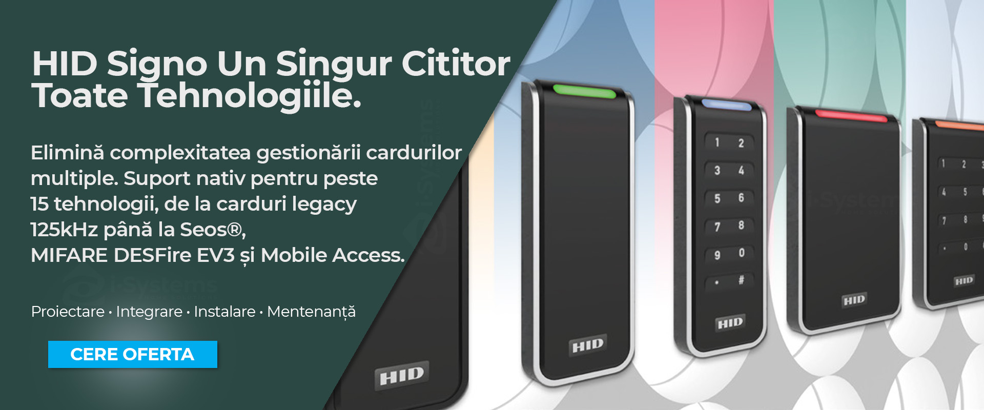 Seos, iCLASS (inclusiv SE/SR), MIFARE Classic si DESFire EV1/EV2/EV3, FeliCa si alte credentale contactless.