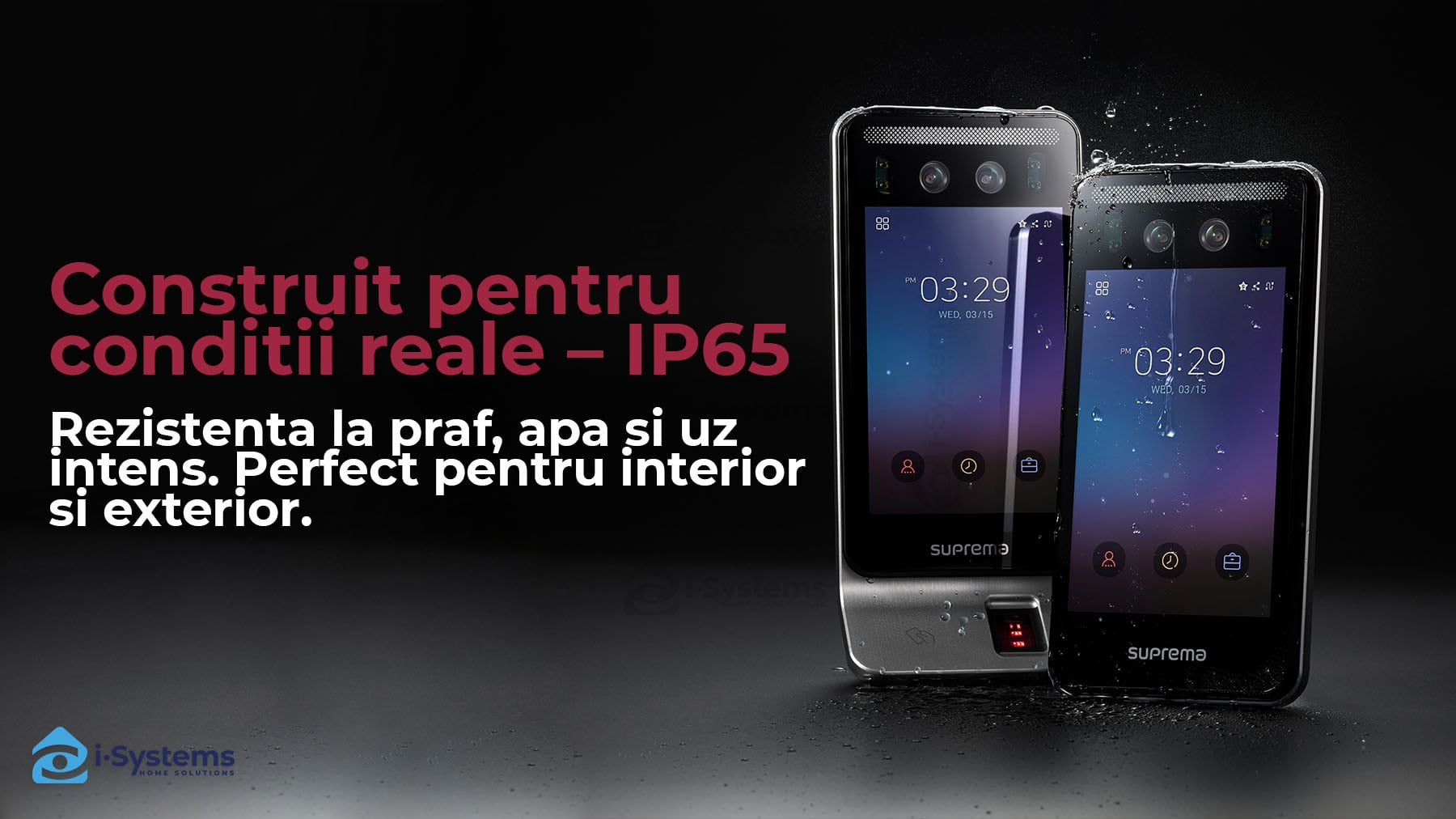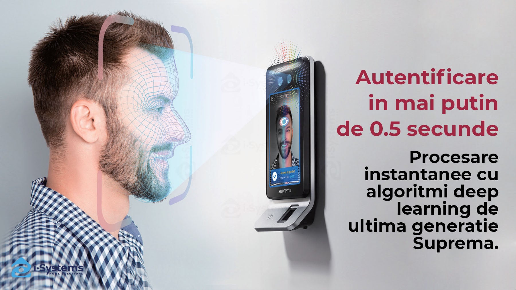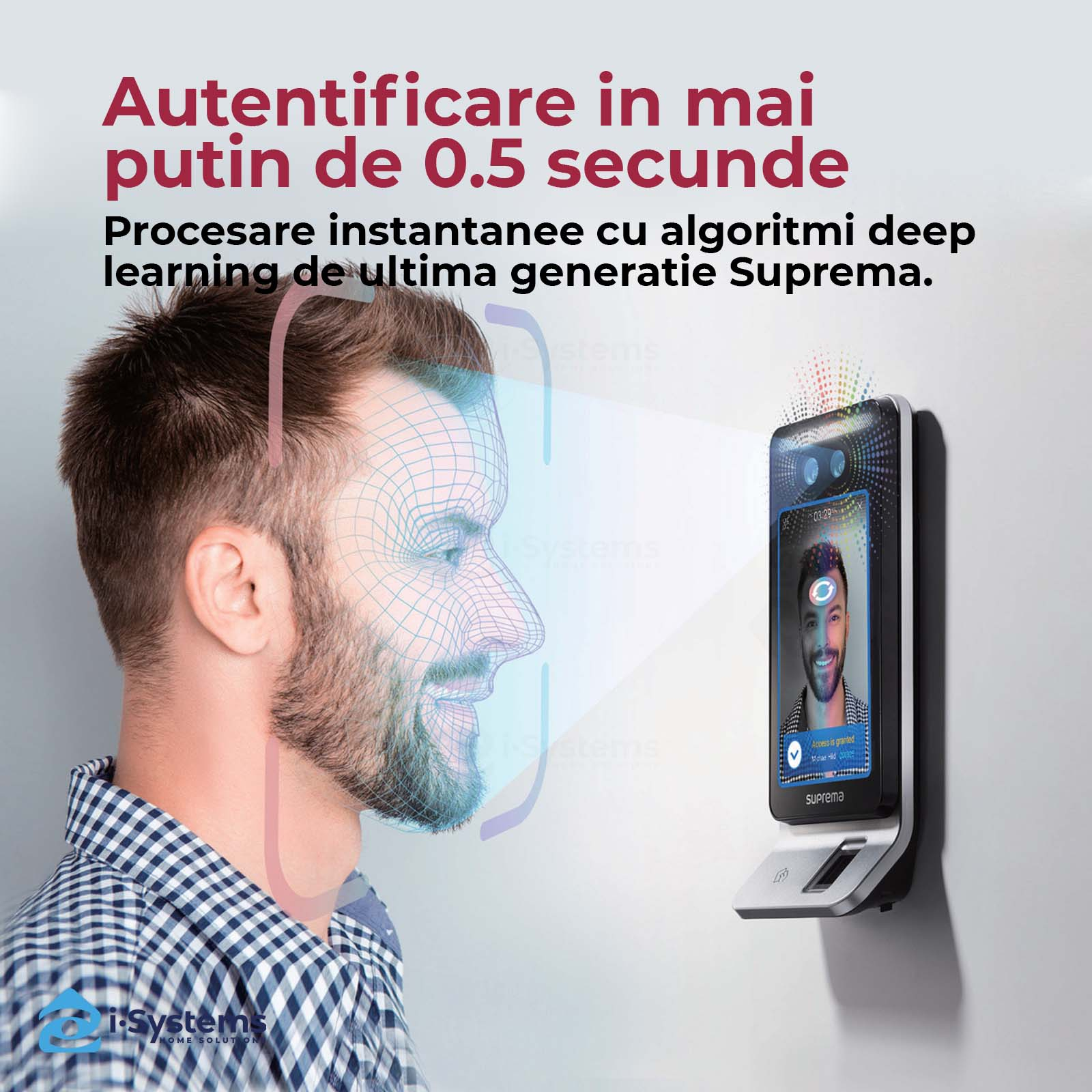 Dispozitivul foloseste procesor Quad-Core si algoritmi AI deep-learning pentru autentificare instantanee. Sistemul anti-spoofing integrat previne accesul neautorizat prin detectie de liveness – blocand tentativele cu fotografii, ecrane sau masti.