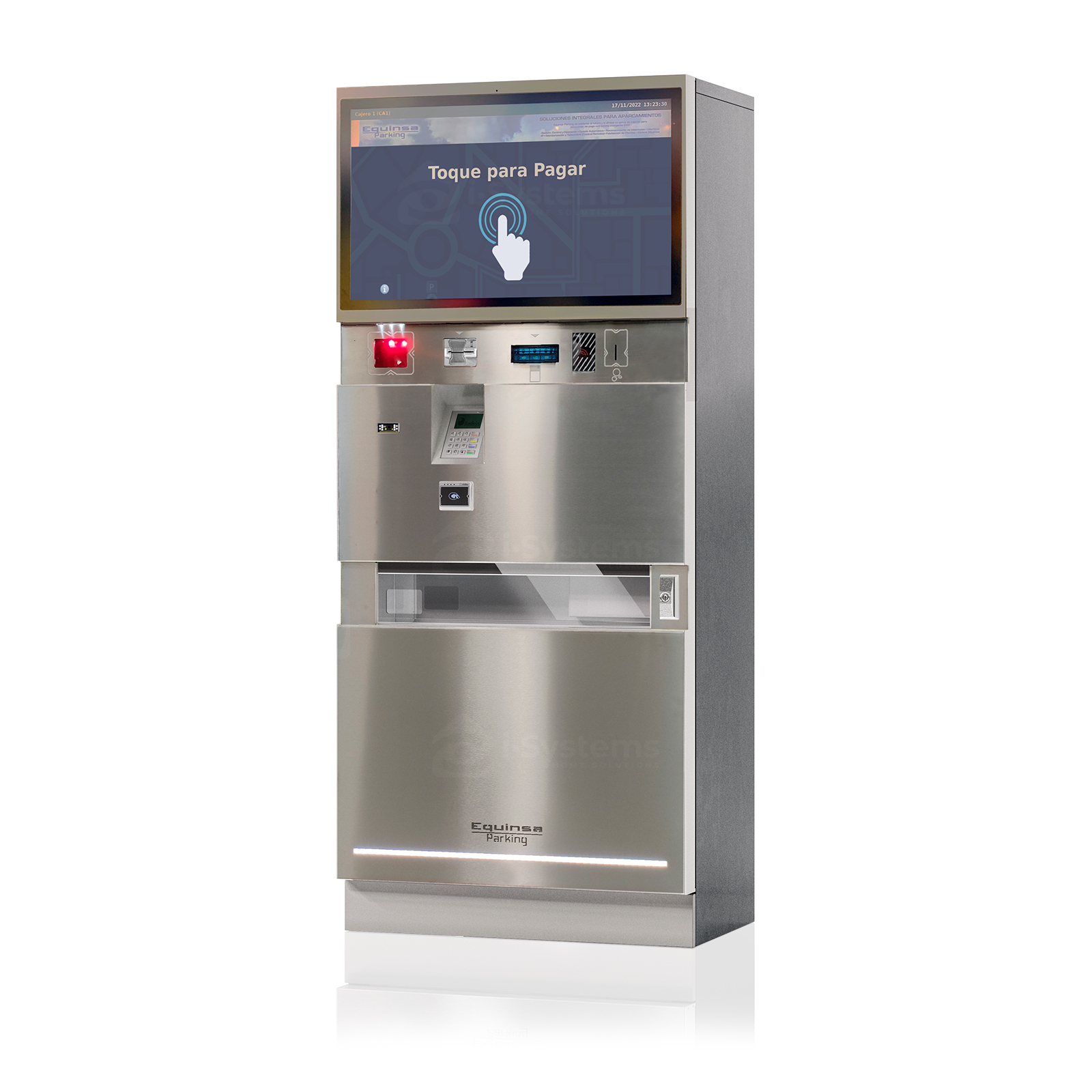 Terminal plata parcare Equinsa SENSE CdB 32” Self-Service Cashless & Cash, cu plata EMV, NFC, QR pentru parcari inteligente, trafic intens, Smart City