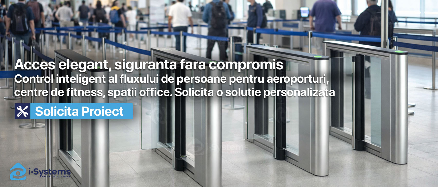 Da. Speed gate-ul este compatibil cu majoritatea sistemelor de control acces prin contact uscat, RS232 sau RS485, inclusiv RFID, QR, biometrie sau carduri.