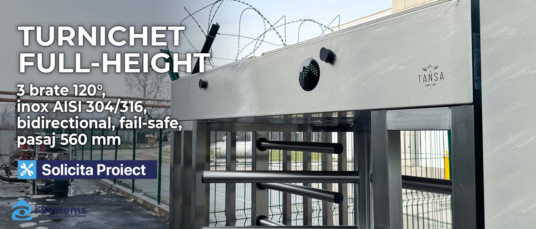 TANSA LTF 113 este un turnichet vertical full-height pentru securitate perimetrala ridicata si control strict al accesului in zone cu trafic intens, instalabil la exterior sau interior. Constructia din inox AISI 304 (optional AISI 316 pentru medii agresive) cu finisaje galvanizate ori galvanizat + vopsire in camp electrostatic ofera rezistenta mecanica si durabilitate. Mecanismul este logic-controlat si permite operare bidirectionala: trecere manuala reglabila pe ambele sensuri sau, la cerere, actionare motorizata. Blocarea electromagnetica controleaza pozitiile de repaus, iar modul fail-safe elibereaza pasajul la caderea tensiunii (optional fail-lock). LTF 113 asigura latime utila de 560 mm si debit tipic de ~20 persoane/min si include indicatori standard in ambele directii, contorizare, setare timp, mod memorie si avertizare acustica reglabila. Recomandat pentru perimetre industriale, stadioane, transport public, campusuri si obiective high-security.